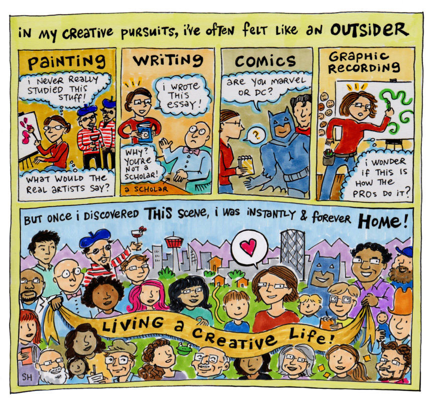 While working for government, corporate, non-profit and educational organizations, Hester got involved in the emerging field of graphic medicine, in which pictures help with health care. Since the term was coined in 2007 by the British doctor/cartoonist Ian Williams, the graphic medicine genre has become widespread among scholars, health care practitioners and artists as both a way to communicate with caregivers and a teaching tool at medical schools. In her earlier autobiographical comics, Sam Hester had written about health care before, for instance about her dealing with postpartum depression and her care for her mother with Parkinson's Disease. Especially her experiences as a caretaker of her mother - who lived with her for about six months before moving to an independent living residence - made her realize the possibilities of graphic medicine. To create awareness about what her mother's specific needs were, Hester began making drawings for the hospital staff. Since then, she has expanded her work in graphic recording by specializing in graphic medicine jobs. Her work includes making visual stories that capture the experiences of patients and families, but also graphic maps to help people navigate their own personal health care journey. A strong advocate of the graphic medicine movement, Sam Hester promotes this intersection of comics and health care on stage, in articles and as guest in podcasts.