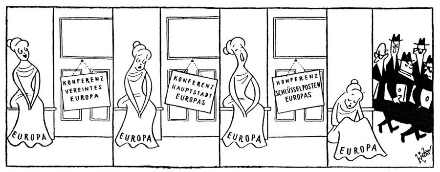 Cartoon by Wolfgang Hicks. Europa waits for the conference results regarding united Europe, the capital of Europe and the European key points.