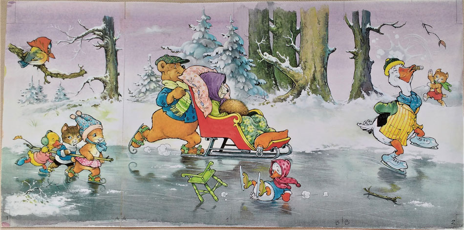 Artwork with Toonder-like characters by J.C. van Hunnik for a British accordion-format booklet 'Let's go ice skating'. Most likely not an official Toonder Studio's product.