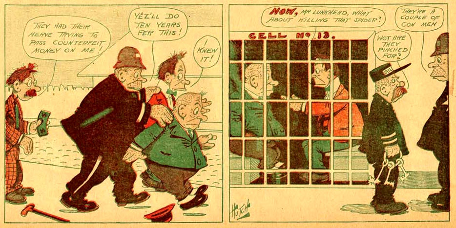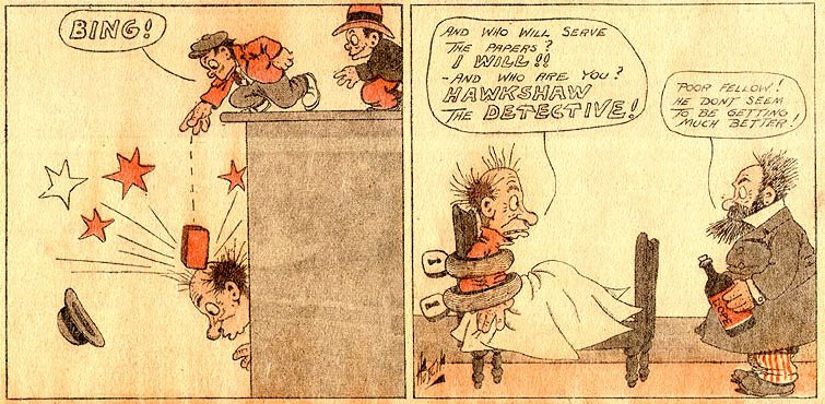 In the Chicago Tribune, Hutchinson published 'Willie Hawkshaw, the Amateur Detective', which ran between 27 August 1905 and 29 April 1906. The name 'Hawkshaw the Detective' was borrowed from a character in Tom Taylor's theatrical play 'The Ticket-of-Leave Man' (1863), though much of Hutchinson's character was modeled after Arthur Conan Doyle's 'Sherlock Holmes'. Interestingly enough, Gus Mager later had a comic strip named 'Hawkshaw the Detective' (1913-1947).
