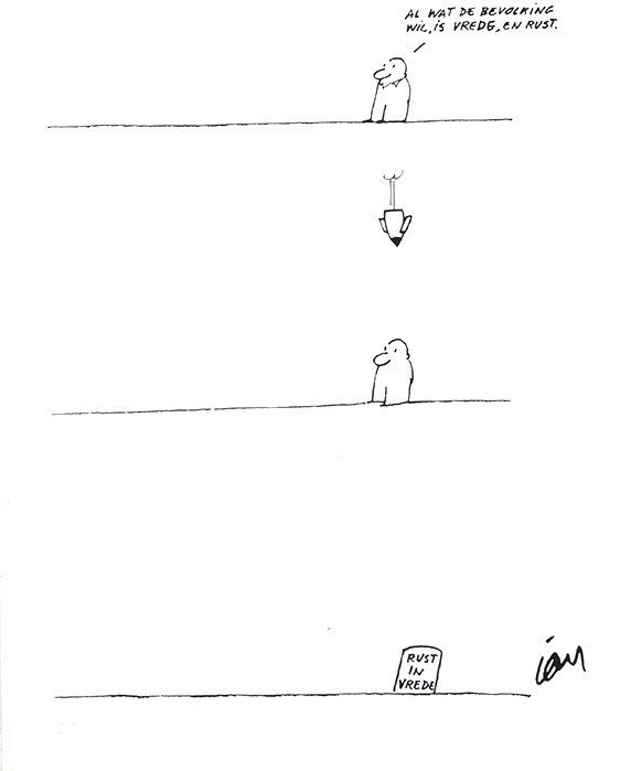 In 1981, Ian released a compilation of thematic cartoons under the title: 'De Kiosk. 100 Karikaturen uit het Jaar 2030'. The hundred cartoons imagined the then distant year of 2030, when Flanders has become a prince-bishopric. Ian imagined that one single magazine would remain - De Kiosk - read by only one person.