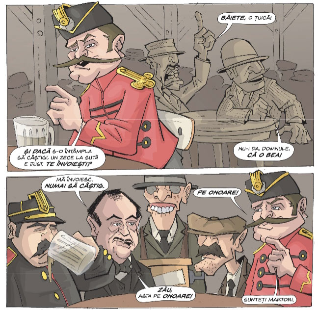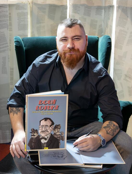 In 2023, Ionescu and publisher Editura Grafic released Ionescu's comic adaptation of the short story 'Două Loturi' ("Two Lots") by the satirical Romanian author and playwright Ion Luca Caragiale (1852-1912). According to a 2024 interview by Ema Cojocaru for www.editura-art.ro, the idea of adapting this particular story came from Mad Magazine and a dream in which the artist encountered Caragiale's literary character Nenea Iancu ("Uncle Iancu"), who told him that all of the author's works had been adapted into comics, but that 'Două loturi' was reserved for him. For his adaptation, Ionescu kept most of the original story, about a clerk who loses his winning lottery ticket, but he also used much of the atmosphere from the 1957 movie adaptation. In the background, he subtly added characters from other Caragiale works.
