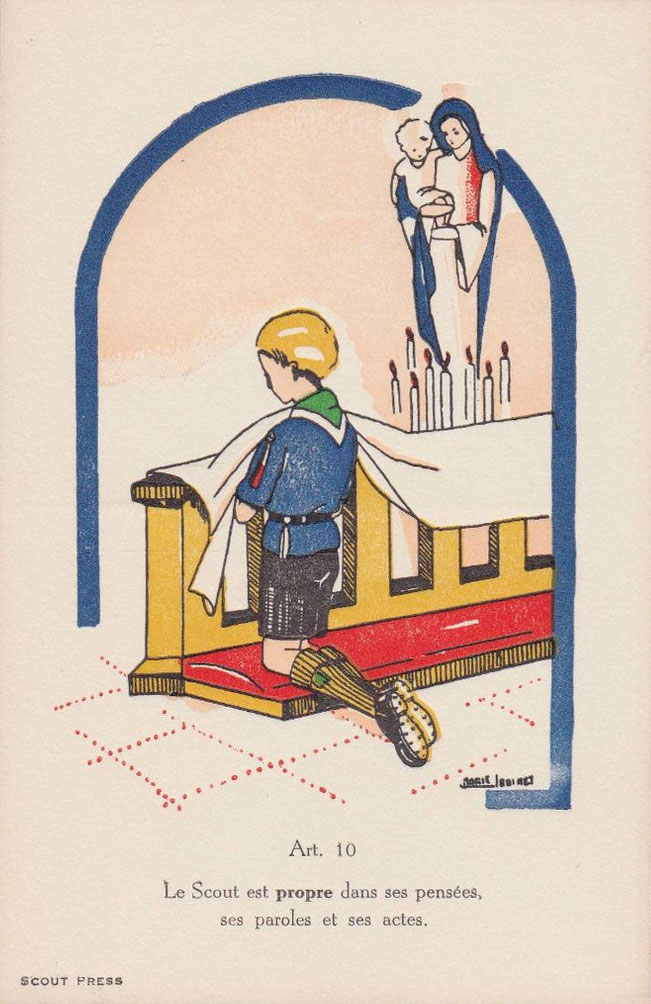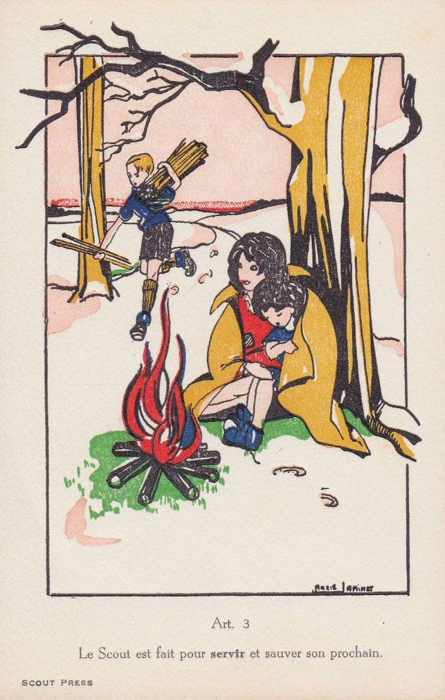 Not much information about the artist Marie Jaminet is known. During the 1930s and 1950s, she made illustrations for several Catholic publications in Belgium. Her work included devotional illustrations, drawings for the Catholic youth movement Le Patro and several Scout/youth novels written by Norman Dale and Father Albert Hublet for Éditions Desclée De Brouwer. Her work with Hublet included the books 'Marée Grise' (1947), 'Les "Masque rouge"' (1948), 'Mammy' (1949), 'Le Commando de l'Ange' (1952) and 'Service du Roy' (Éditions de l'Œuvre Saint-Augustin, 1954). She also illustrated installments in the book series 'Spirou-Sélection', published by Éditions Dupuis, for instance 'La Petite Marchande de Bonheur' by Simone Saint-Clair. Another booklet with her illustrations was 'Peau d'Ane' (1948), published by Editions Novos in Lausanne.