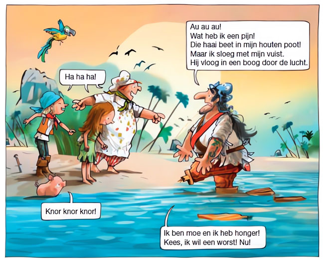 One of Mark Janssen's regular clients is the educational publisher Zwijsen. Besides illustrating picture books for early readers for the publisher, he has also made drawings and comic pages for its school magazines, such as Zomerlezen. Starting in 2008, Janssen also drew installments in Zwijsen's comic book series for early readers. In 2007, Janssen's first comic book was 'Vuur van Tuur', about a young dragon who is not allowed to spit fire in the house and then flies away from. The book's two kid characters Koen and Kaat returned in Janssen's next volume, 'Hiep Hiep, Daar Is Piep!' (2008), about a big bird who suddenly drops into the children's garden. In 2010, Janssen created the landscape-formatted comic book 'De Boot van Sint en Piet', a story tying in with the annual Sinterklaas festivities. In the same format, he subsequently made the comic book 'Blijf van Big af!' (2013), about a hungry pirate who wnats to eat a little piglet.