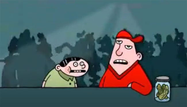 In the 2000s, some of Jeroom's cartoons were animated, usually to serve as advertisements for Humo, the Rock Werchter Festival or as video bumpers during Humo's annual Pop Poll Shows. Between 2004 and 2005, Jeroom directed animated TV commercials for the SMS service of the music video channel TMF. The shorts featured two characters he created exclusively for TMF, namely the youngsters Daan and Seppe, voiced by Adriaan Van Der Hoof (Seppe) and Tom De Wispelaere (Daan). Each episode had the obese Seppe give the short-sized, squeaky-voiced Daan far-fetched tips on how to pick up girls. The shorts always ended with Seppe accidentally wounding Daan, although Daan always acted as if it was nothing. In 2005, the characters also starred in a music video based on a remix of Willy Sommers' classic 1971 pop song 'Zeven Anjers, Zeven Rozen'. Under the influence of LSD, the duo praises the schmaltzy lyrics. The concept was very similar to the animated music video of 'I Got You Babe' (1994), in which Mike Judge's Beavis & Butt-head interact with pop singer Cher. In 2014, Jeroom also signed a contract with the American TV channel Comedy Central to create 30 animated shorts based on his comics, broadcast on the show 'TripTank'.