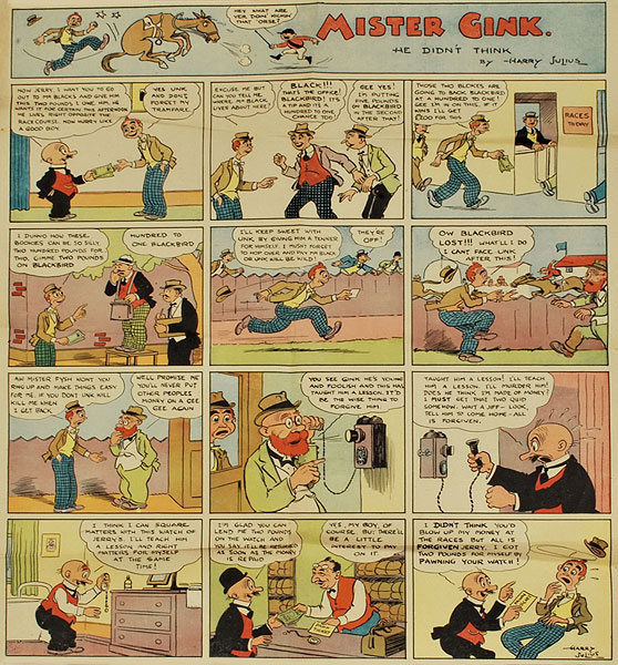 By August 1926, Julius appeared in the comic section of the Sunday News with his comic 'Mr. Gink' ("Mr Gink - He Didn't Think!", in full). Starring the gullible Hercules Gink, the strip was described as "the escapades of a much harassed and henpecked gentleman." It became Harry Julius' most famous comic strip, which the cartoonist also dramatized on air in collaboration with the well-known ventriloquist and radio personality Russ Garling. The segment was part of Julius' weekly radio show 'Air Cartoons', which he started in 1927.