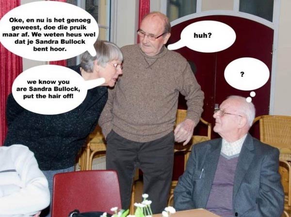 Translation: "O.K., that's it. Take off that wig. We all know you're Sandra Bullock." - "Huh?"