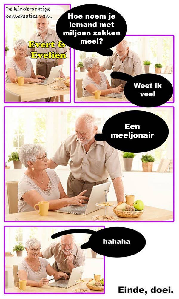 The elderly couple Evert and Evelien are regular characters in Kakhiel's photo comics. Evert is actually András Arató, a Hungarian former electrical engineer who often appears in stock photographs circulating on the Internet. Other online users have also featured him in a series of Internet memes, under the name 'Hide the Pain Harold'. It gained Mr. Arató a certain online fame. In an interview he stated that he's aware of this phenomenon, but doesn't mind, since he too also finds these memes amusing. The translation of this particular episode goes as follows: Evert: "What do you call somebody with a million bags of flour? A millionaire." (An untranslatable pun on "meel" (= "flour") and "miljonair" ("millionaire")).