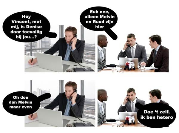 Translation: - "Hey Vincent, it's me, is Denise there?" - "Eh, no, only Melvin and Ruud are here." - "Oh, do me Melvin then." - "Do it yourself, I'm straight."