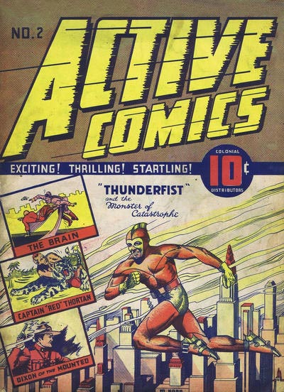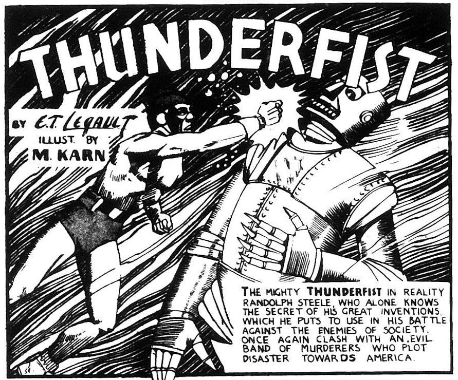 With writer Edmund T. Legault, Murray Karn was responsible for creating one of the first Canadian superheroes, 'Thunderfist, the Crime Crusher'. The character made its debut in the first issue of Active Comics, which hit the newsstands in February 1942. The main hero was circus strongman Randolph Steele, who uses the inventions of his murdered scientist brother to create superhero powers and a fitting costume for his battle against all threats to society. After six episodes, Karn took over the writing as well, and he continued the feature on his own until issue #12 (July 1943).