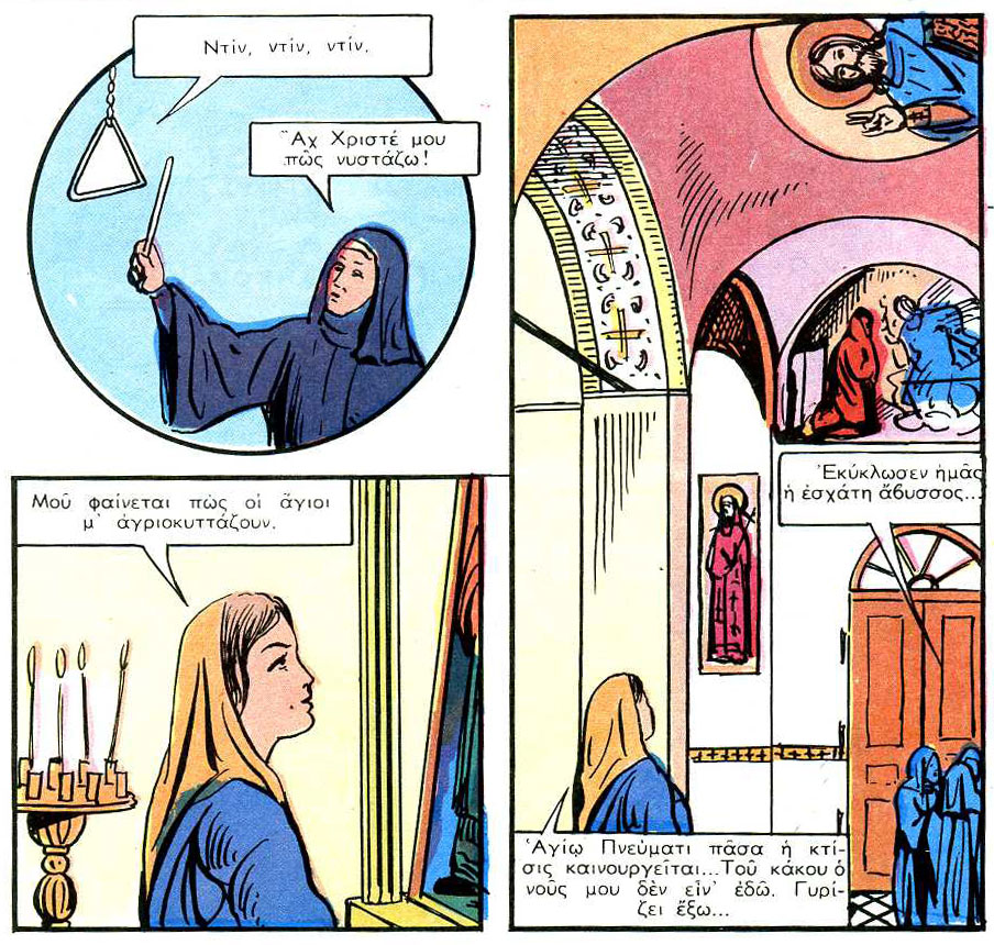 While still a student in Athens, Katsoulidis also had a short venture into comic art, drawing an installment in the Greek 'Classics Illustrated' series ('Κλασσικά Εικονογραφημένα'), published by the Atlantis publishing house of Giorgos Pechlivanidis. Originally merely a translated version of the American comic book series with adaptations of literary classics, by October 1953 these translated editions were supplemented with locally produced installments, presenting tales from Byzantine/Greek history and ancient mythology in comic book format. In 1955, Katsoulidis drew issue #173, 'Kassianí' ('Κασσιανή'), about the 9th-century female Byzantine-Greek composer, hymnographer and poet Kassia. It was reprinted in the 1970s.