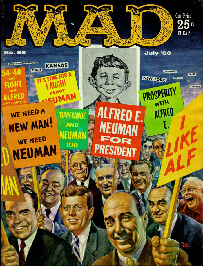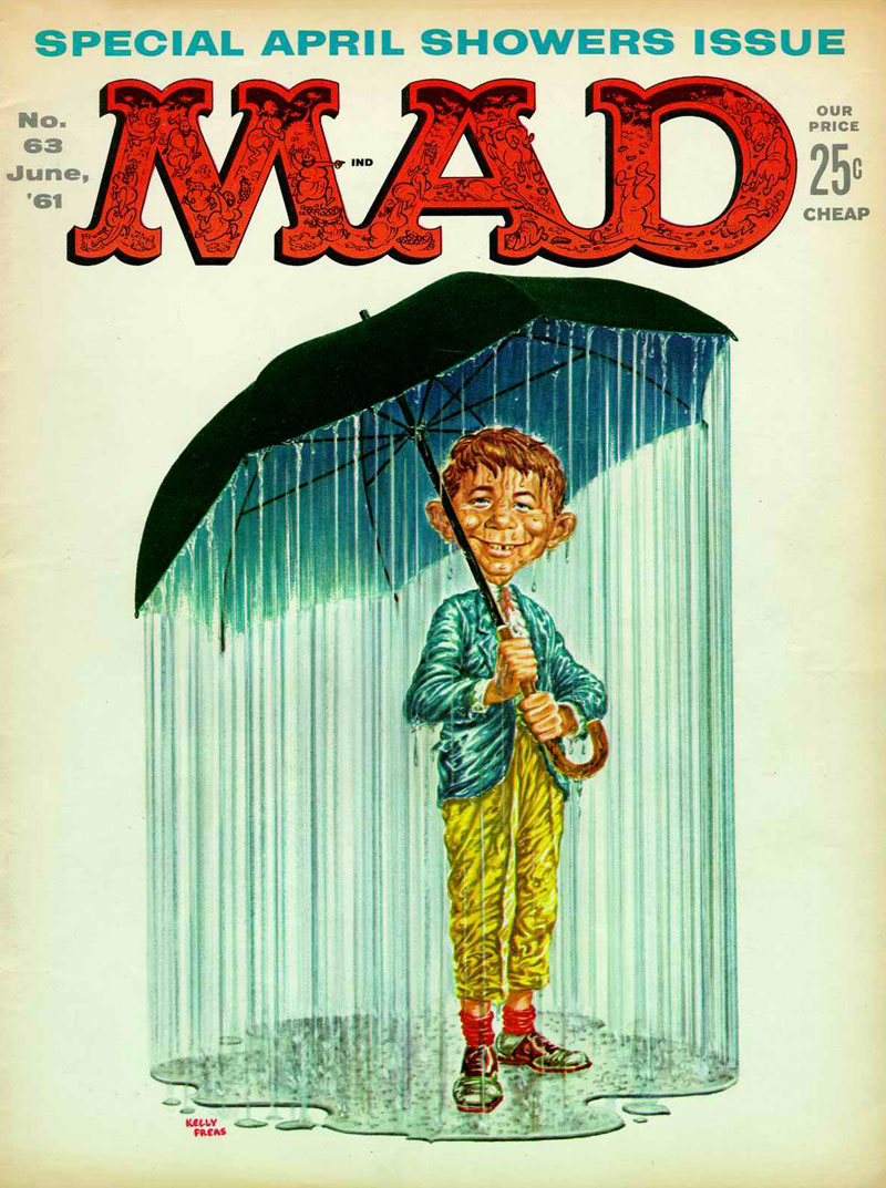 Between 1957 and 1964, Freas was also a regular contributor to the satirical comic magazine Mad, albeit more as a front and back cover illustrator. Like his predecessor, Norman Mingo, he often portrayed Mad's mascot, Alfred E. Neuman, in realistically-drawn but illogical situations. Several have become classics, frequently reprinted on official Mad merchandising products. Among them Alfred swinging upside down (issue #58, October 1960) or with rain pouring down on him from underneath an umbrella (issue #63, June 1961). Another memorable cover was issue #46 (April 1959), which at first shocked longtime Mad readers, since it shows Alfred announcing "the end of Mad". However, it was April Fool's Day. Underneath this dramatic headline, the full announcement can be read in smaller print, informing the reader that with "the end" they meant "the back cover", adding: "For the beginning of Mad, turn the magazine upside down, stupid!". Freas also received the honor of designing Mad's 10th anniversary issue (issue #72, July 1962), depicting Alfred with a pie smashed on his face.