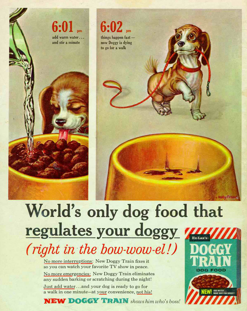In Mad issue #41 (September 1958), Freas drew a comic strip spoofing Chesterfield cigarettes. In sharp contrast with the glamour of the original ads, the parody shows a sleazy tramp asking passersby for a light. After being refused, the beggar picks up a cigarette butt from the street and smokes this one instead. The promo talk nevertheless keeps praising the cigarette's excellence. Another notable sequence by Freas ran on the back cover of issue #72 (July 1962). The first panel shows a dog eating from a bowl. Unbeknownst to the mutt, his owner has put some laxatives in the food, making the animal anxious for a walk in the second panel. The sarcastic promo talk promises: "Just add water... and your dog is ready to go for a walk in one minute - at your convenience, not his! New Doggy Train shows him who's boss."