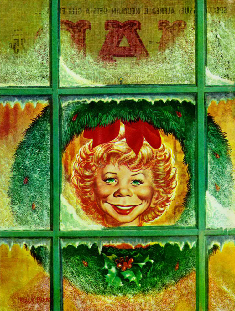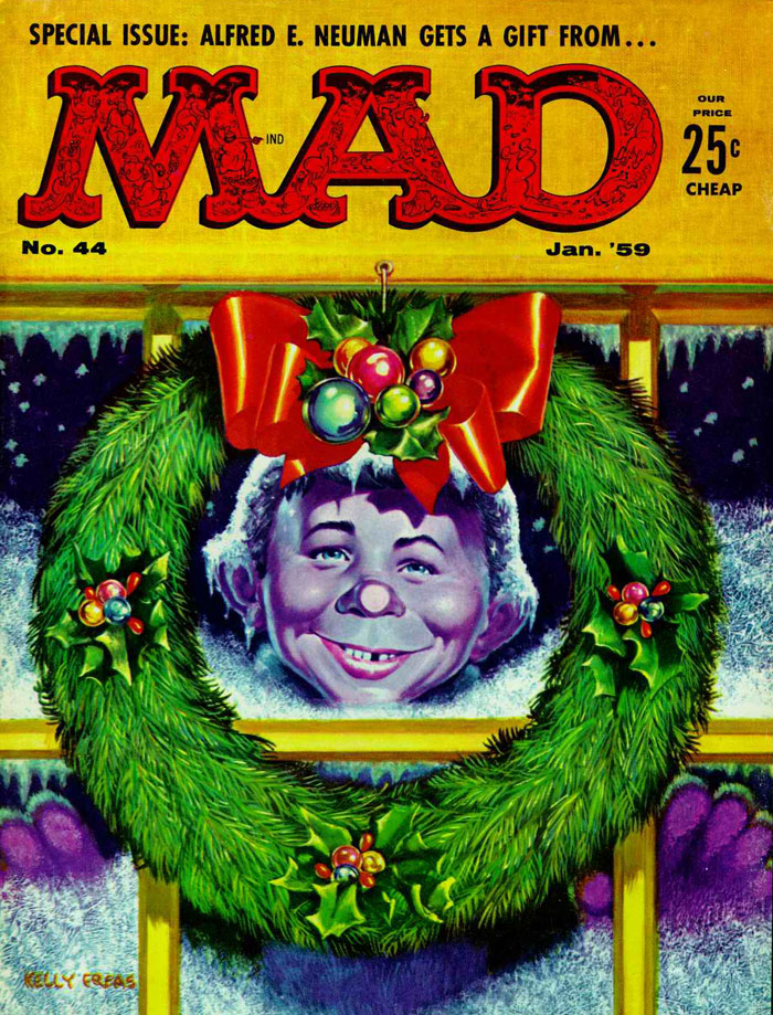 Two Christmas-themed covers by Freas have frequently been reprinted for special holiday offers. The front cover of issue #44 (January 1959) depicted Alfred standing outside during a cold winter night, staring at a mistletoe hanging inside the living room. The back cover shows the opposite perspective, with a feminine version of Alfred standing inside. For issue #52 (January 1960), Alfred stands among Christmas carol singers with a change dispenser, so listeners can ask their money back. Since the object is nowadays barely recognizable to younger generations, reprints of the original illustration aren't always depicted in full, but only show the faces of Alfred and the singers.