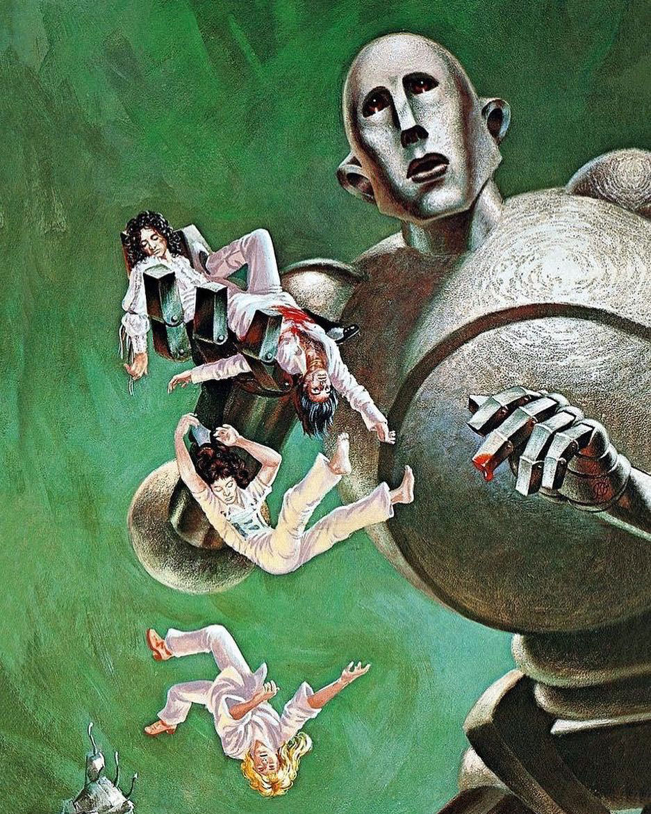 Freas reused the same giant robot from his magazine illustration, only with Queen's band members as the corpses. Inside the sleeve, the colossal robot breaks through a building, terrorizing citizens. During Queen's 1977-1978 'News Of The World' tour, Freas' artwork was used on official tickets, posters and other merchandising. Record label EMI made a few small-sized robot sculptures to be put on display in various record stores. During Queen's concerts themselves, a giant robot was used as a special effect. As a tribute to Freas, it was named "Frank".