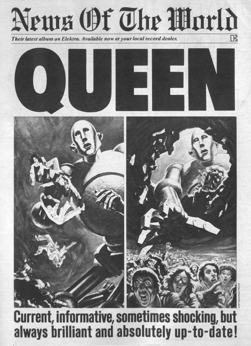 Promotion for Queen's 'News Of The World' album, showing Kelly Freas' outer and inner sleave illustrations as a sequence.