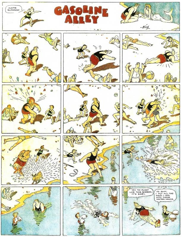 For such a cozy family comic, the Sunday episodes of 'Gasoline Alley' frequently feature bold graphic experiments. King enjoyed treating a full page as if it was a single scene, despite still dividing it into panels. Many of these pages toy around with lay-out, design and color. In a 2 December 1928 Sunday page, most of the characters are depicted in silhouette.  A famous gag from 24 August 1930, shows Walt and Skeezix at the beach. The entire page is one large drawing, divided by 12 panels, with all action shown from a bird-eye's perspective. All Walt and Skeezix do is move through the sunbathing crowd to reach the sea and take a swim. Another episode from 19 August 1934 has Skeezix look at himself in the reflection of a river, imagining himself floating through this upside down world.