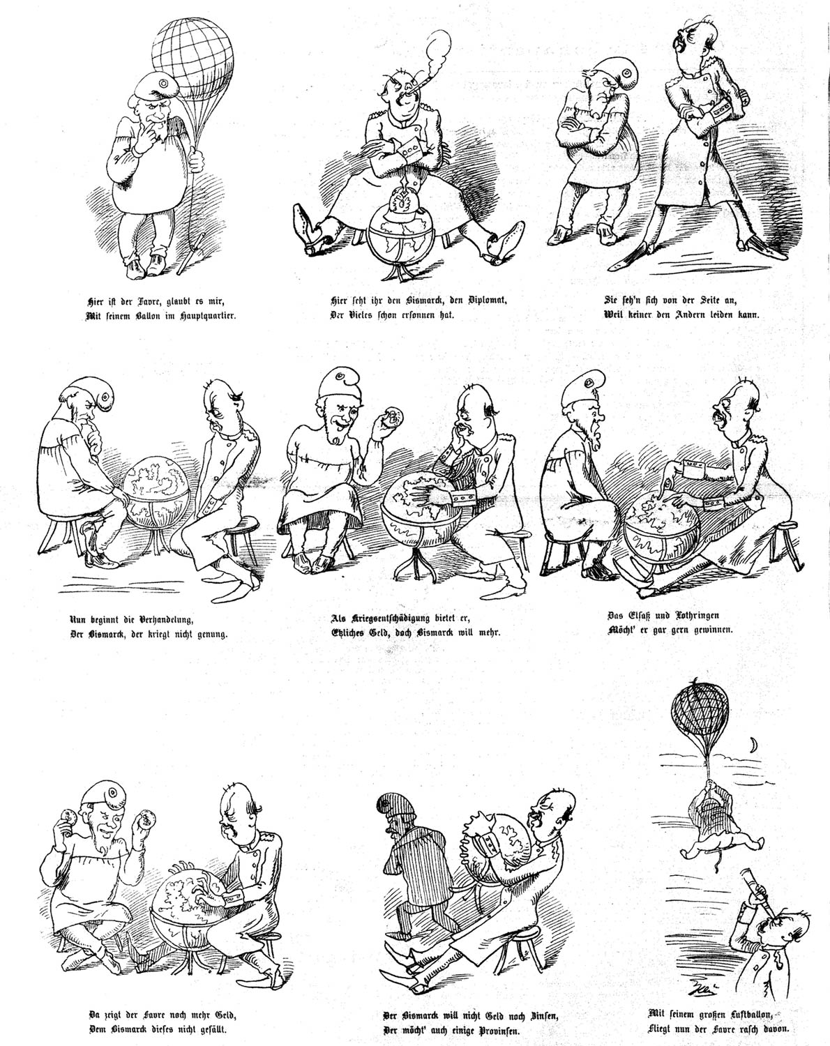 In 1870, Klíč drew a political comic strip named 'Die Friedensverhandlungen' ('The Peace Negotiations', 1870). It depicts the French Minister of Foreign Affairs Jules Favre (recognizable by his Phrygian cap and hot air balloon) and German chancellor Otto von Bismarck having a discussion. Favre tries to compromise with Bismarck by offering him money, but Bismarck just wants and ultimately gets the French province of Alsace-Lorraine. The angry French politician returns home by air balloon to tell the bad news. The embarrassment continues as he flies off, because everybody can look underneath his gown and see his bare behind. Bismarck even picks up a telescope to get a better view.