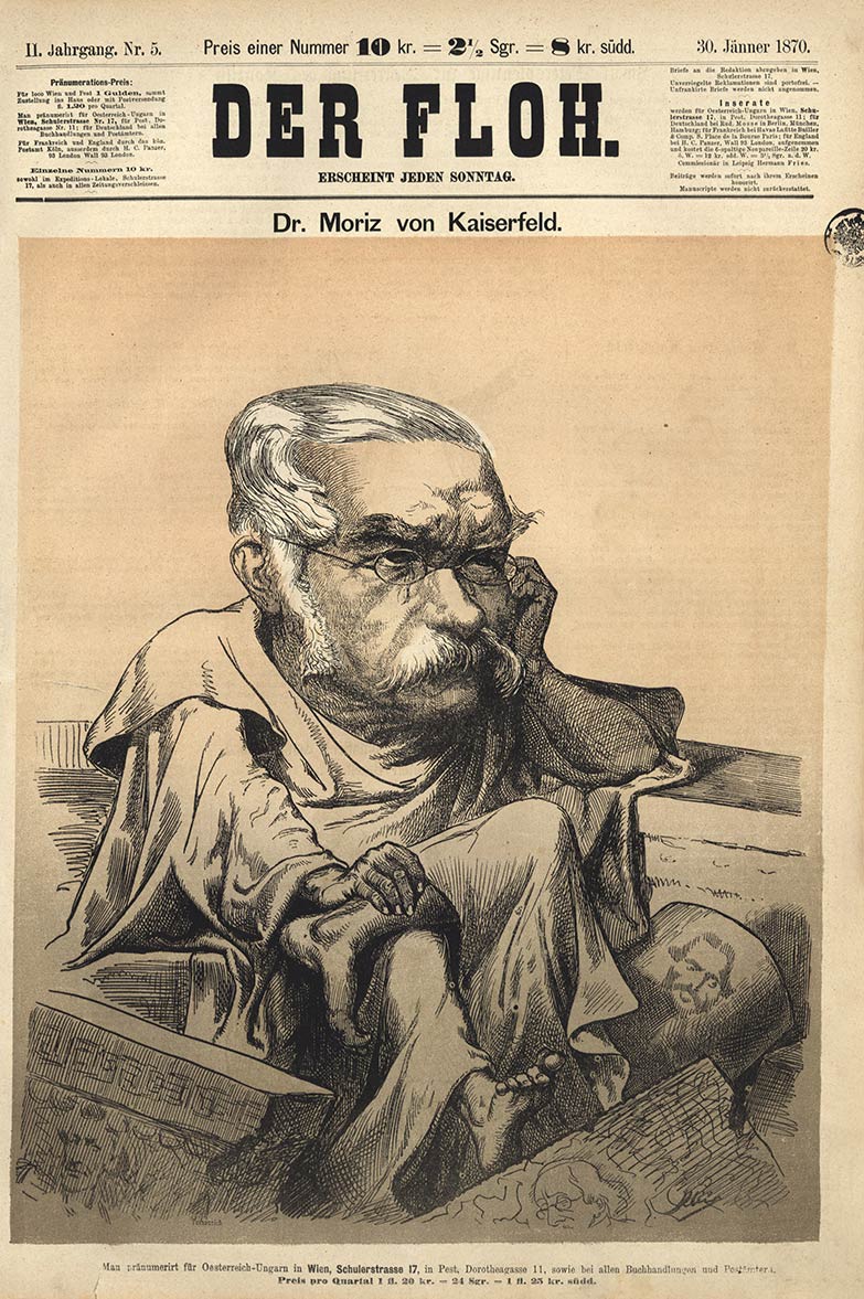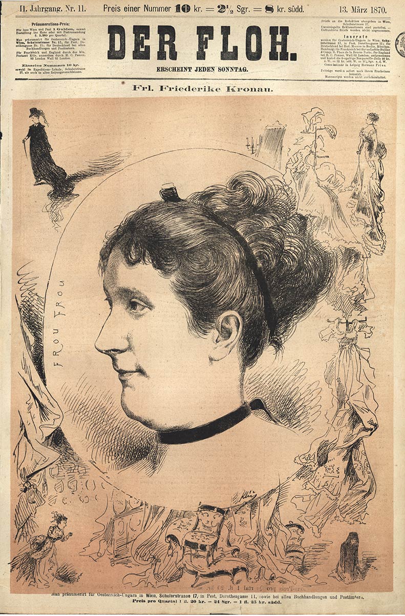 Magazine cover for Der Floh, dated 13 March 1870, portraying German-Austrian actress Friederike Kronau. The second cover dates from 30 January 1870 and portrays Austrian politician Moritz Kaiserfeld von Blagatinschegg.