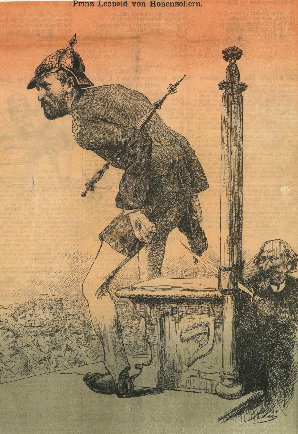1870 cartoon depicting German prince Leopold, Prince of Hohenzollern, trying to sit on the Spanish crown while French emperor Napoleon III sticks a bayonet underneath his behind. It references the fact that Prince Leopold was offered to become the new Spanish king, but Napoleon III opposed this idea out of fear that this would lead to more German political power in Spain.