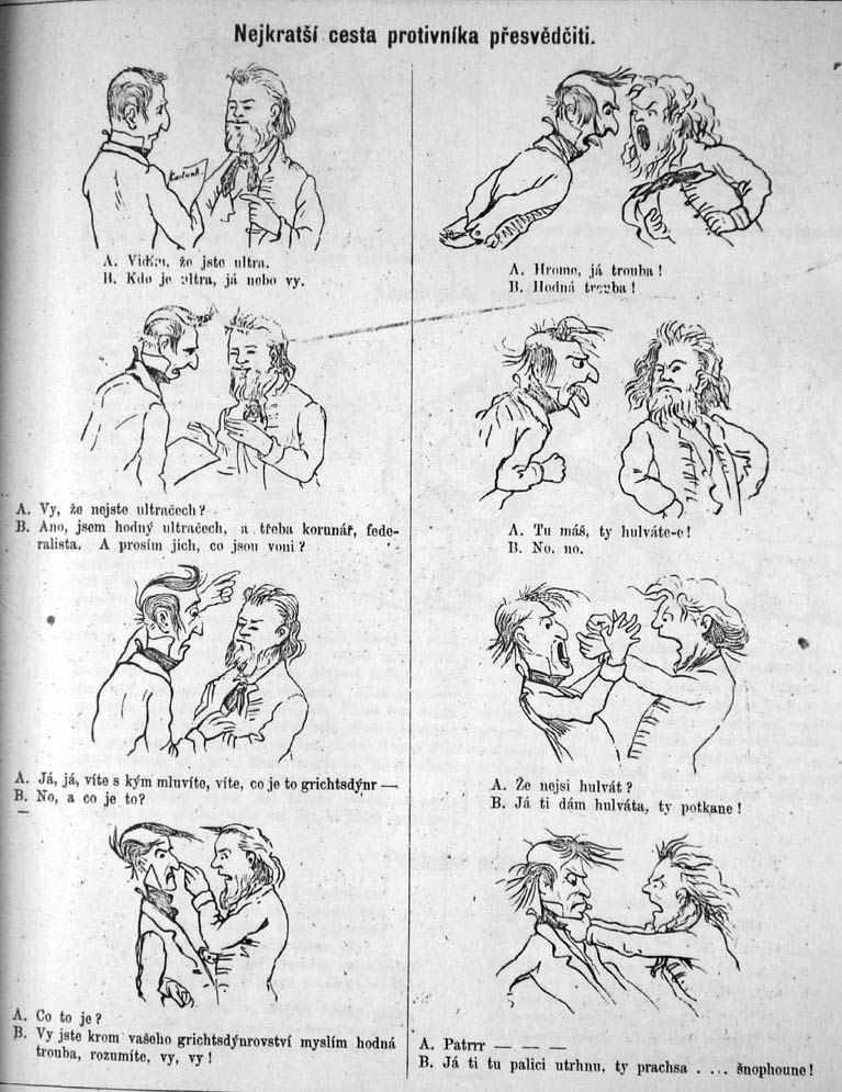 In 1866, Klíč published a text comic about a political debate. It stars two politicians whose argument grows so heated that they eventually begin to fight. The idea was funny but not new. It already appeared in the German magazine Fliegende Blätter in 1848. Klíč wasn't the first one to plagiarize it, though. In 1849, Dutch illustrator Christiaan Le Blansch traced it for the Dutch magazine Polichinel and in 1860 the same cartoon also appeared in the Brazilian weekly Semana Illustrada, presumably drawn by Heinrich Fleiuss.