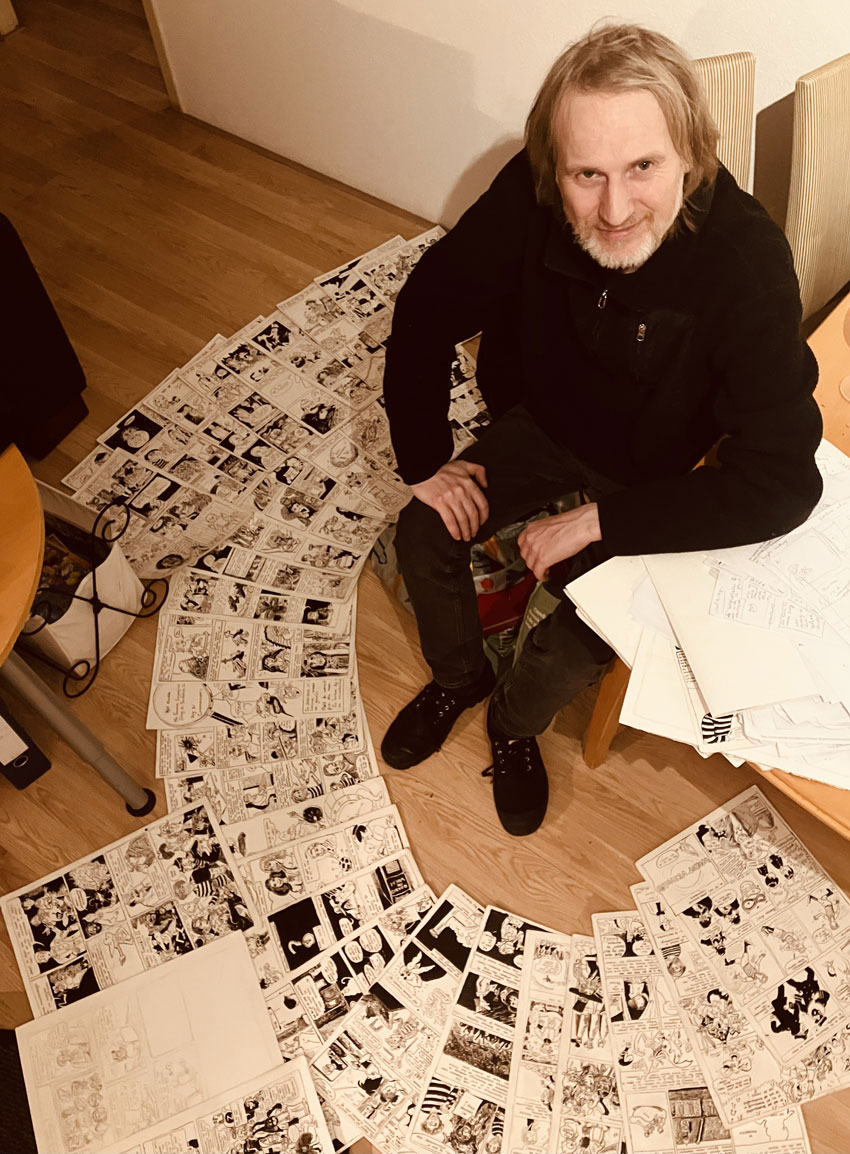 Kjell Knudde with the finished pages of his Pandemic Comic at Comiclopedia HQ in Bas Schuddeboom's house, New Year's Eve 2023-2024.