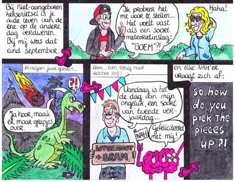 At first, De Koning drew funny stories about her friends and their lives, but when her rehabilitation center asked her to make a comic about her overstimulation therapy, she had found her niche. Since then, De Koning has been chronicling her own rehabilitation process, but also the stories of other people with acquired brain injury, or from the perspective of their loved ones. Characterized by a positive sense of humor and an ability to put things into perspective, De Koning's aim is to help people understand what brain injury is or identify with it.