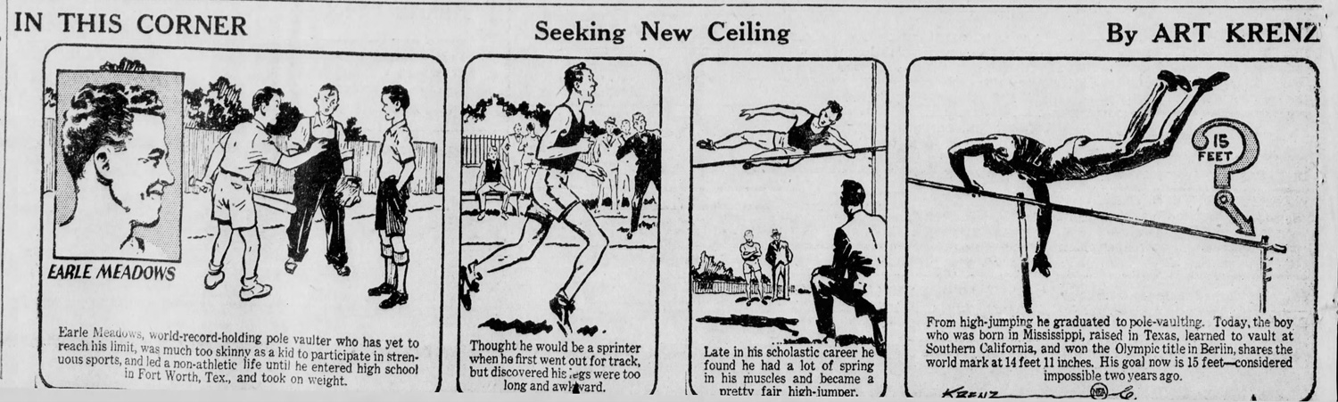 As part of the NEA Service staff, Krenz was also assigned to some of the company's in-house productions. Between 14 December 1928 and 17 April 1929, he illustrated the documentary-style comic strip 'The Book of Knowledge', succeeding the original artist P.V. Bessey. The feature was loosely adapted by Bill Braucher from the children's encyclopedia of the same name by the W.C. Stripling Co. In April-May 1929 Krenz briefly succeeded Joe King as cartoonist of the 'Radiomania' cartoon series, before he passed the pencil to Dorothy Urfer. Krenz's comics features of the 1930s were also educational and short-lived. He educated the readers about the development of coins and currency ('Money - From The Stone Age Till Now', 1-13 May 1933), the history and new talents of baseball ('Baseball's Big New Names' and 'One Hundred Years of Baseball', both from 1939) and the history of U.S. horse racing ('Tale Of The Turf', 19 April-9 May 1939). In the second half of the decade he made the inconsistently appearing quiz feature 'Do You Know?', which tested the reader's knowledge about sport subjects, as well as the sports-related educational feature 'In This Corner'.