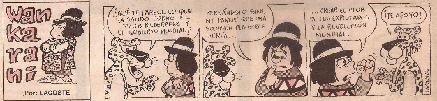 By 2000, Lacoste was also working for Palante, one of the country's oldest humor magazines. His main creation for the magazine was 'Wankarani', a monthly comic strip about an heroic South American boy who protects his country's natural resources from looters, hunters and other enemies of nature, with the help of the Native People and jungle animals. Editorial Pablo de la Torriente has published several books with 'Wankarani' since 2009.