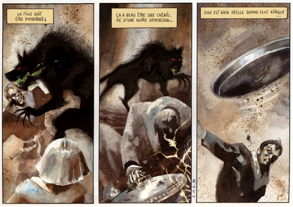 Eric Larnoy's biggest claim to fame as a comic artist was the 'Thanéros' series, made in collaboration with the scriptwriters Denis Parent and Claude Carré. A troubled Earth couple accidentally crosses the border between the human realm and that of Thaneros, a mysterious world with its own logic and laws. While their presence disrupts the Thaneros world, mysterious creatures like the Majordomus and Scryba make them unwilling pawns in a bizarre game. Created in a semi-realistic drawing style with impressionistic and steampunk elements, the first two installments of this complex narrative were published by the publishing house Novedi. When that company went bankrupt, a third volume appeared in the Spotlight collection of Éditions Dupuis. Due to tensions between the authors and the new publisher, the fourth and final episode of 'Thanéros' never appeared.