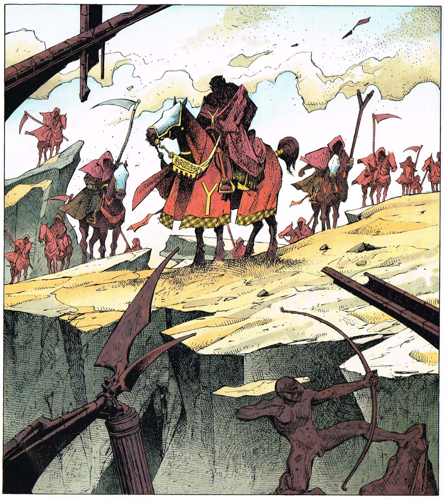 Born in 1960, Eric Larnoy began his career during the 1980s, drawing postcards and record covers. Between 1983 and 1986, he designed many fantasy-inspired covers for metal Bands (including Heir Apparent, Exxplorer, Druid, Castle Blak and Steel Vengeance) on the French Black Dragon label. In 1987, he created the interactive comic album 'La Sphère du Nécromant' ("The Necromancer's Sphere") with scriptwriter Thierry Cailleteau for Éditions Delcourt. It was basically a fantasy role-playing game, where the reader determines the story's course. Later that decade, Larnoy was also one of the illustrators of 'Athanor - Masques' (Shiroz Productions, 1989), a book related to the sci-fi RPG 'Athanor'.
