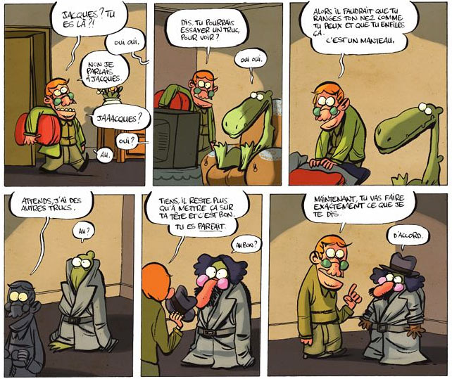 The feature has continued as 'Jacques, le Petit Lézard Géant' in Spirou's regular pages since then, and has been collected in books by Dupuis since 2008. Libon has also made 'Les Cavaliers de l'Apocadispe' for Spirou, as well as the vertical comic strip about an avid comic fan called 'Animal Lecteur' in cooperation with Sergio Salma.