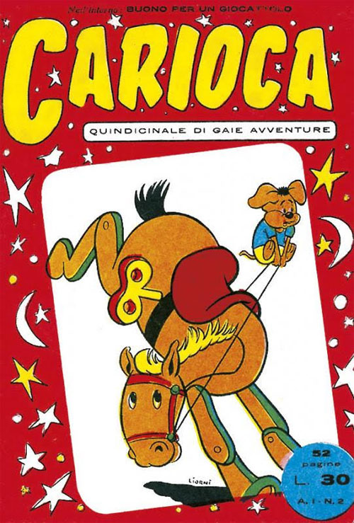 Liorni wrote the first three issues of the biographical comic book series 'I Grandi Esploratori' (1958), about famous explorers (art by V. Canevari), as well as issues #46 through #48 of 'Buffalo Bill' (art by Tullo Palasciano). He notably wrote and drew many features for the publishers children's publications. In the funny animal comic book Frugolino, he was present with 'Negretto Tom' (1955-1956) and 'Prosciuttino', both drawn by Raoul Buzzelli. He additionally contributed stand-alone stories with the artist Fernando Bonomini, who used the pen name F. Bines. Liorni and Bonomini also collaborated on the feature 'Il Tesoro della Zitella' ("The Spinster's Treasure"), which was serialized in Miciolino in 1959. Early funny animal artwork by Liorni appeared in the comic book 'Fantasia del Buonumore', published as a supplement to Gatto Felix ('Felix the Cat') in 1955.