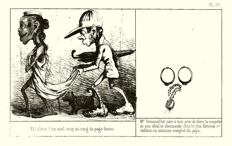 The same year as 'Mr. Tuberculus', Lobrichon drew a second picture story, 'Histoire de Mr. Grenouillet' (1856), about a fisherman who travels to the Kakaïkakouka Isles. During his trip, he is pulled into the ocean by a whale, which he had caught with his fishing rod. On the isle, he encounters indigenous people, led by a king. On 17 October 1856, this book was also published by Arnauld de Vresse, again in landscape and text comics format.