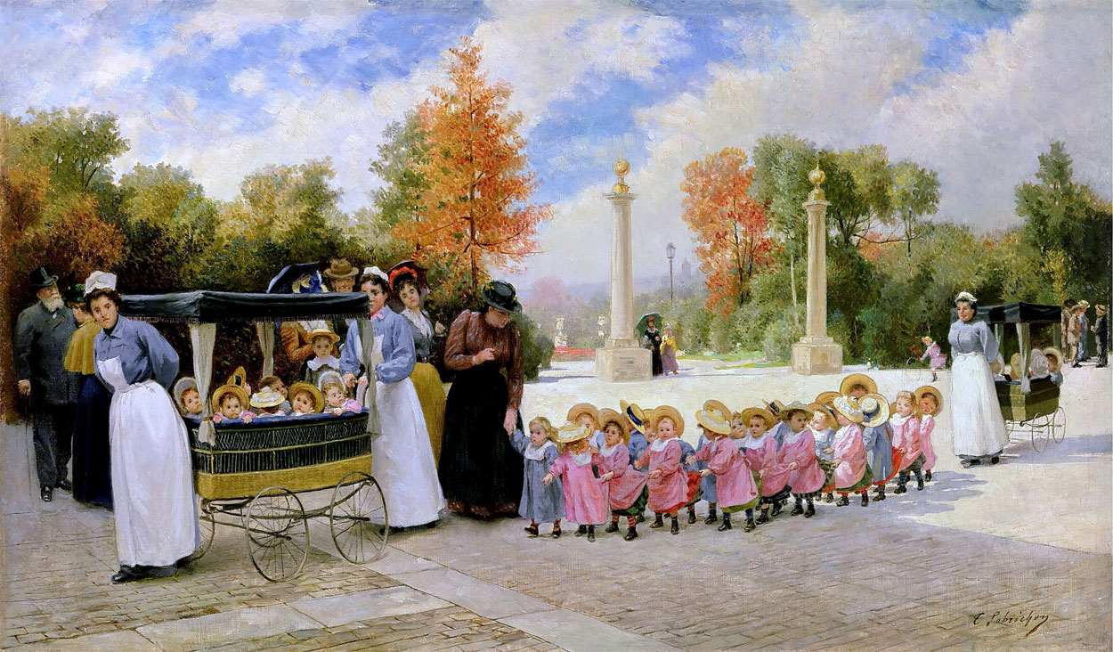Lobrichon was best known for his mood paintings of children. They depict little boys and girls playing games ('Jeux d'Enfant', 1874), studying ('La Leçon de Lecture Gratuite', 1864), being punished ('En Pénitence', 1865) or taking a walk ('Promenade des Enfants'). Everything is drawn in a sweet, sentimental style which emphasizes the cuteness of children and an overall nostalgia for childhood. A typical example and his best-known painting is 'La Vitrine du Magasin de Jouets' ("The Toy Store Window"), which shows young girls gazing in delight at toys through a shop window. Lobrichon also illustrated the popular novel 'La Chanson de l'Enfant' ('The Song of a Child', 1884), written by Jean Aicard. His paintings were exhibited in the Knoedler Gallery in New York City, and also in Melbourne, Australia.