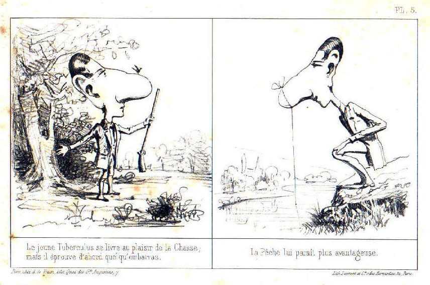 In 1856, Lobrichon drew a picture story, released on 28 June of that year by the Parisian publisher Arnauld de Vresse. It is a text comic, with the rhyming narration underneath the images. The book is presented in landscape format (a rectangular-shaped book). The protagonist, Mr. Tuberculus, is described as a happily married corresponding member of the Clysomanie Company. Tuberculus and other characters reveal Lobrichon's background in caricature, as they are all drawn with huge heads. Tuberculus in particular has huge ears and an enormous nose, which serves as a source of comedy throughout the story. For instance, the nose proves to be useful as a fishing rod. Yet his smell organ constantly gets him in trouble too. No matter what activity he tries out - hunting, painting, playing pool, climbing trees - his nose gets stuck, hurt or swollen up, causing all kinds of mayhem. As he bumbles from one slapstick adventure into the other, Tuberculus eventually finds a purpose in life by becoming a scarecrow.