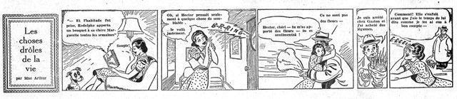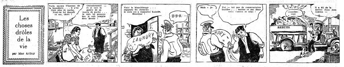 Mac Arthur was the author of the comic strip 'Les Choses Drôles de la Vie' ('The Funny Things In Life'), that ran in the Québec City newspaper Le Soleil in 1943. The origin is most likely American, since one of the strips advertizes U.S. war bonds, and one of the characters is called 'Ms. Hazard'. The abbreviation for the syndicate is NWNS.