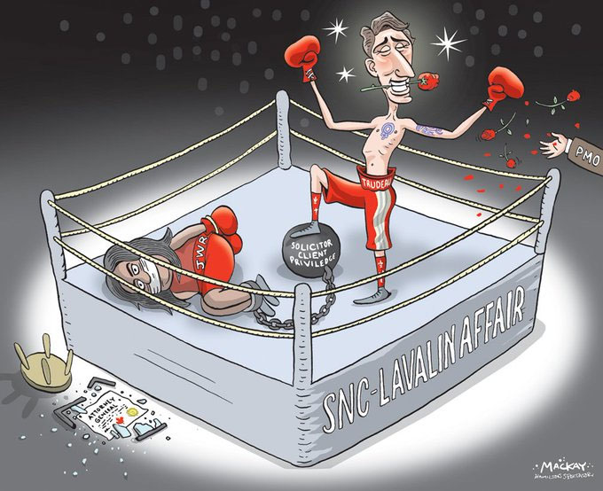 In 2019, the government of Canadian Prime Minister Justin Trudeau was accused of pressuring Minister of Justice Jody Wilson-Raybould to politically intervene during a criminal investigation of bribery and corruption within the company SNC-Lavalin. She resigned, while Trudeau remained in power. On 15 February 2019, MacKay drew a cartoon of Trudeau as a boxer in the ring, triumphing over Wilson-Raybould who lies down on the floor, bound, gagged and with a ball and chain reading "solicitor-client privilege" written on it. The cartoon drew objection because it parallelled violence against (indigenous) women, especially since Wilson-Raybould's caricature was shown in a defenseless position. A similar cartoon by Michael De Adder about the same topic drew criticism for the same reason.
