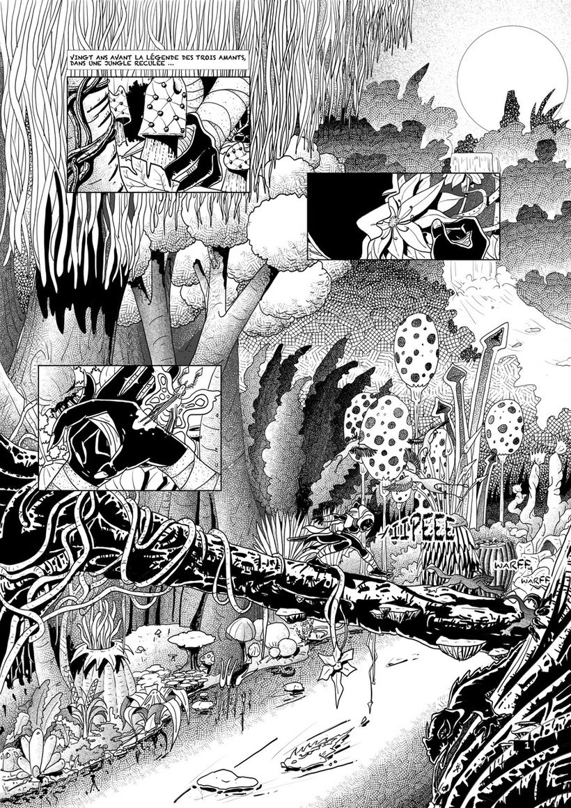 Malot then began working on 'L'Étoile Miraculeuse', a saga set on an alternative Earth where a new and allegedly miraculous star appears in the night sky. The first cycle follows the astronomer Bra-Him Ben Salim who is at first imprisoned for his controversial thesis about the star, but then sent to investigate the phenomenon. The series allowed the artist to create a dreamlike world with strange landscapes and monsters. Releasing the books through the federative YIL Édition imprint, the first cycle consists of the episodes 'La Légende des Trois Amants' (2016) and 'Le Souffle du Démon' (2017). A second cycle took off with 'Wal-Ham, Origines d'une Sorcière' (2018), followed by 'Bra-Him, la Malédiction du Prophète' (2020).