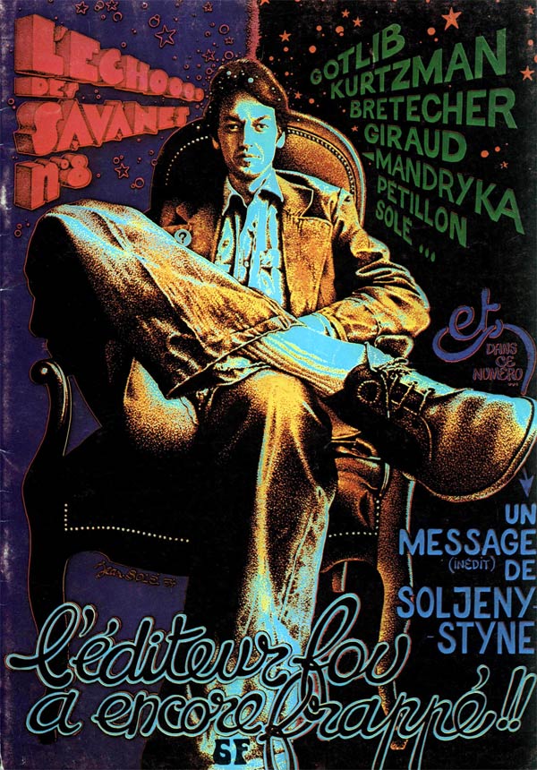However, running a magazine was less easy than it sounded. After ten issues, the magazine still didn't make any money. Near the end of 1974, the original team broke up. Claire Brétécher became a staple in the leftist press, and Gotlib moved on to launch his own magazine, Fluide Glacial. Not wanting to lose his investment, Mandryka continued L'Écho des Savanes in the role of editor-in-chief. The trimestrial magazine became a bi-monthly publication, and new artists, writers and editors were brought in. Among the new contributors were Ted Benoit, Carali, Philippe Druillet, Jean Giraud, Yves Got, Jacques Lob, René Pétillon, Martin Veyron and Philippe Vuillemin. The magazine also ran translated stories from U.S. underground comix and material from Mad Magazine under Harvey Kurtzman's editorship. Thanks to this reboot, L'Écho des Savanes managed to keep on going. Mandryka left in 1979, selling his rights for a symbolic franc. He disliked the new direction "his" magazine was taking, with the inclusion of pornographic comics for commercial purposes. In 1995, Mandryka had a brief comeback in L'Écho with the one-shot science fiction story 'Les Aventures Galactiques de Roger Bacon', which was later published in book format as 'Y'A Plus de Limites' (Albin Michel, 1996).