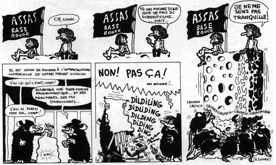 Since Marchal and his friends of the Groupe Union Défense movement were called "black rats" by their opponents, Marchal decided to use this animal when creating a party mascot. Sarcastic, provocative and militant, he also used this character in his comic series 'Les Rats Maudits', which was published in the party magazine and the students' publication Alternative (1973-1975). The plotline revolved around a battle between heroic, far-right rats and their left-wing opponents. In another series, 'Scènes de Chasse', Marchal didn't shy away from expressing fascist views. Marchal's rat characters were not so subtly ripped off from Anthracite the black rat from the children series 'Chlorophylle' by the Belgian comic artist Raymond Macherot. In Macherot's comic, Anthracite is a diabolical villain, the nemesis of Chlorophylle and his funny animal friends. Nevertheless, in a 2000 interview, published in issue #13 of the Belgian nationalist magazine Devenir, Marchal claimed he felt more sympathy towards Anthracite, since he considered Chlorophylle a "little square bourgeois". All this while Anthracite openly advocates torture, murder, military coups and even betrays his cronies if it suits him. In the same interview, Marchal also dismissed Macherot's comics for having "no message". A surprising opinion, since many comic fans tend to praise the author of 'Chlorophylle' and 'Sibylline' for his clever, original satire of human society. Marchal seems to have not caught on to this, or conveniently ignored these elements to create his own derivative concoction of Macherot's work.
