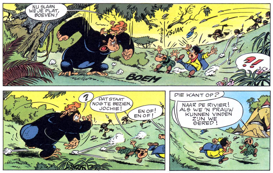 Between 1975 and 1977, Mazel and Cauvin published the first short stories of their next creation, 'Boulouloum et Guiliguili' (1975-1987, appearing in the Dutch edition as 'Ramtamtam en Kieriekielie'). Aimed at Spirou's younger readership, the series presents the jungle adventures of a red-headed mini-version of Tarzan, Boulouloum, and his best friend, the strong gorilla Guiliguili. In 1978, the first serial, 'Le Grand Safari', took off. Set in the Kawangana nature reserve, the two heroes have to protect the elephants from the ivory hunters Yo and Hary. Among their allies are the photographer Miss Stevenson and her team and the savage girl Pin-Up. Much of the early stories relied heavily on slapstick humor, exemplified by the snake being madly in love with Hary, and therefore constantly drops on top of him to cuddle him in her grip.