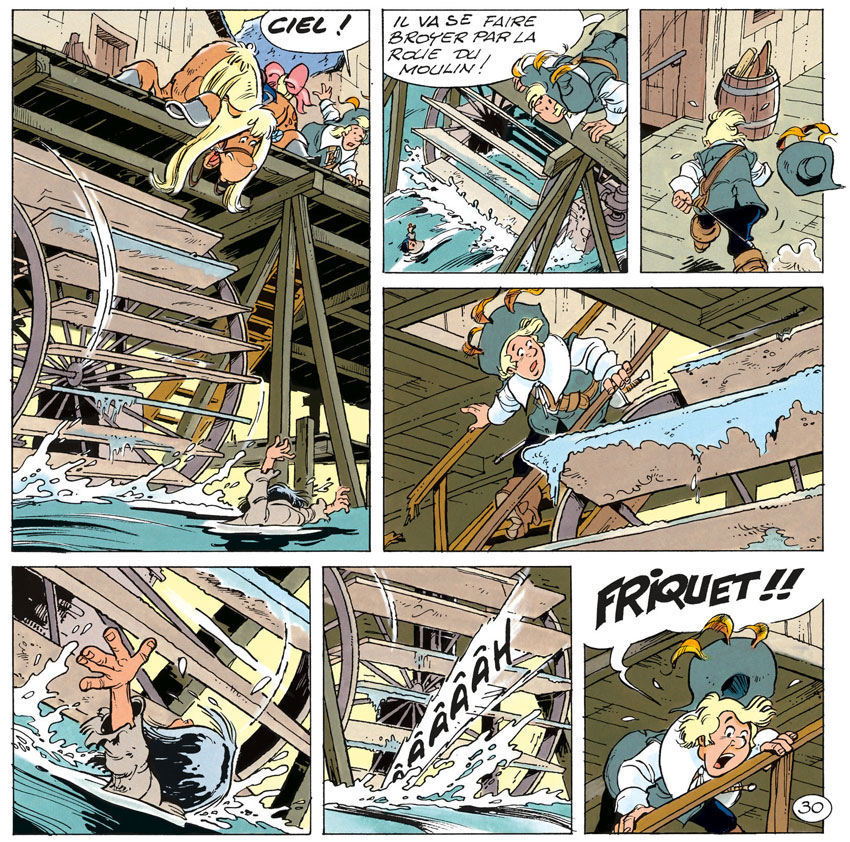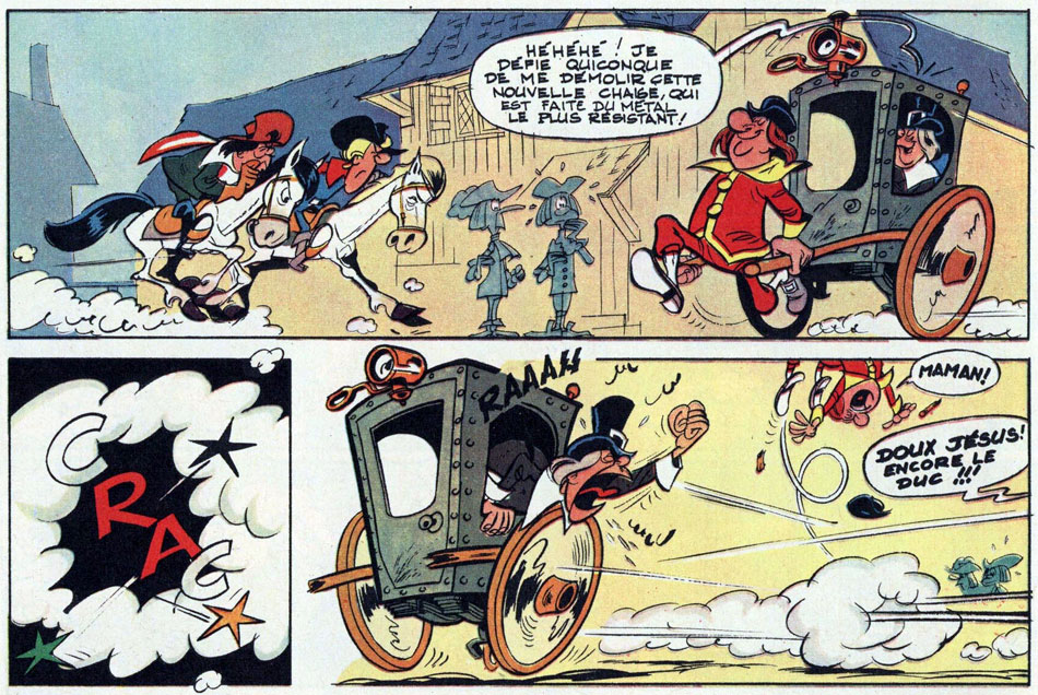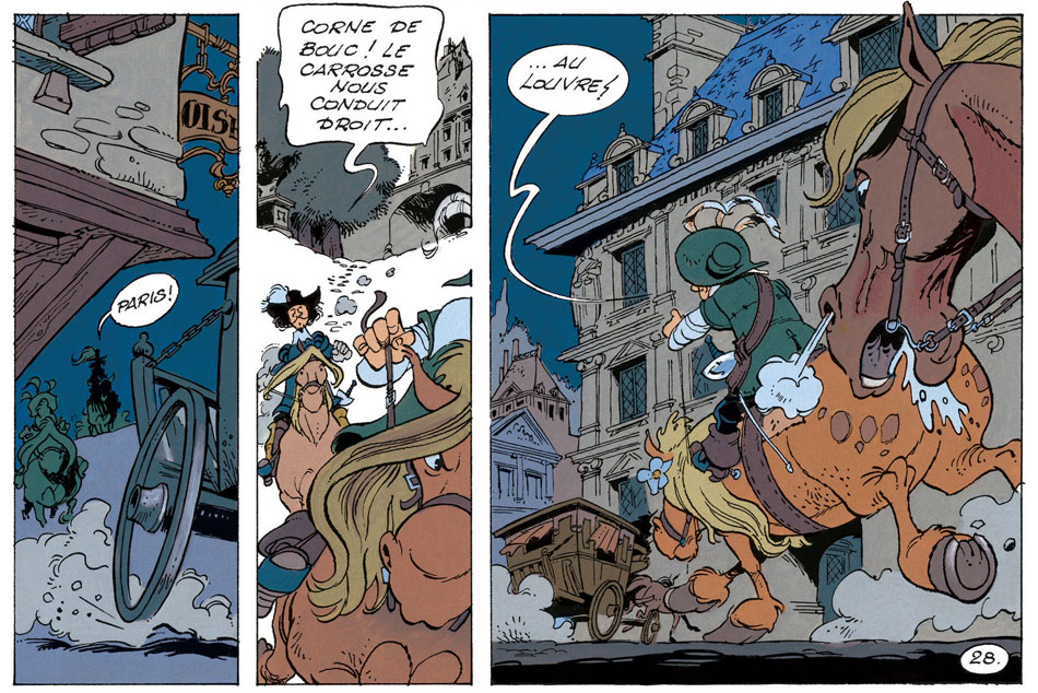 Still, Mazel envisioned a more documented approach to the musketeer genre. When he proposed his editor to do the writing of the series as well, the offer was refused. Instead, Mazel and Cauvin - who always remained on good terms with each other - were set to work on another project. In 1976, the last serial of 'Les Mousquetaires' by the original team came to an end in Spirou magazine, followed by a final gag page in 1978. Over the course of the 1980s, Mazel, as sole creator, regularly revived his characters in short stories and gags. Between 1989 and 1992, Mazel was finally able to write and draw four new serials of 'Les Mousquetaires', using well-documented plots and a less cartoony graphic approach.