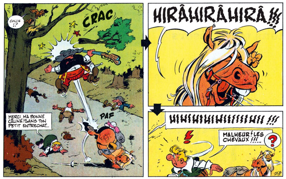 In the opening story, the undisciplined and debauched musketeers Château-du-Pape (later renamed to Château-Neuf-du-Pape) and Saint-Émilion are introduced to a youngster wanting to join their team, named Calebasse. Although these characters eventually formed the three musketeers, the initial stand-out character of the series was Câline, Calebasse's eccentric mare. Overweight, strong-willed and with a flower in her Brigitte Bardot-style mane, the animal was anything one would expect from a musketeer horse. Whenever someone, either friend or foe, laughs at her or puts her rider in danger, Câline bites, kicks or just crunches the person by sitting on top of them, while yelling her donkey-style outcry "HIRÂHIRÂHIRÂHIRÂ!".