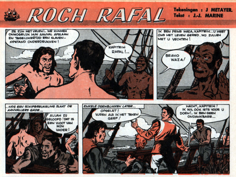 After fulfilling his military service in Algeria, Métayer went to work as a decorator, comic artist and modeler of wax figures. In 1964, he became a cartoonist for Spirou magazine, drawing the second installment of the 'Roch Rafal' pirate feature, written by Jean-Jacques Martine. The first episode, 'Le Faucon des Tropiques' ("The Falcon of the Tropics", 1963), was drawn by Yolande Canale, and showed the 17th-century filibuster colliding with the Spanish forces in the Caribbean Sea. In 'A Pleines Voiles vers l'Aventure' ("Full Sail Towards Adventure", 1964), drawn by Métayer, Roch Rafal is a privateer in service of king Louis XIV, sent to the Isle Bourbon to investigate an uprising against the governor. The story was serialized in Spirou in late 1964 and 1965, and so far the only known comic by Jacques Métayer.