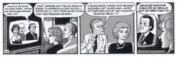 When the market for comic books dried out in the late 1980s, Mevin returned to newspaper comics, this time appearing in the Daily Mail. He drew the daily gag comic 'The Soapremes' (1986-1987), a parody of American soap operas like 'Dallas' and 'Dynasty'. The series was notable for featuring a lot of cameos of popular TV stars, including Joan Collins, Bill Cosby, Leonard Nimoy and Terry Wogan. In November 1992, Mevin succeeded Dennis Collins as the artist of Maurice Dodd's 'The Perishers', a strip about a gang of street kids and an Old English Sheepdog. Following Dodd's scripts, Mevin continued 'The Perishers' until the writer passed away on 31 December 2005.