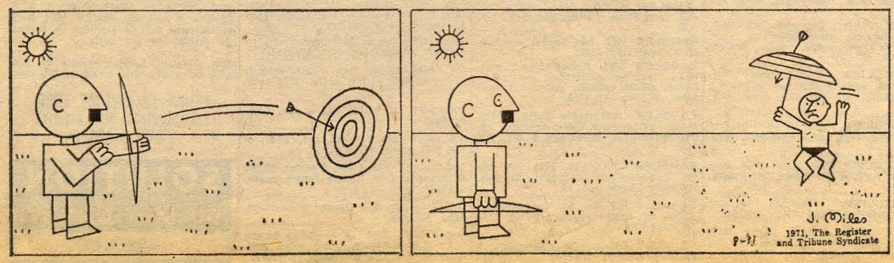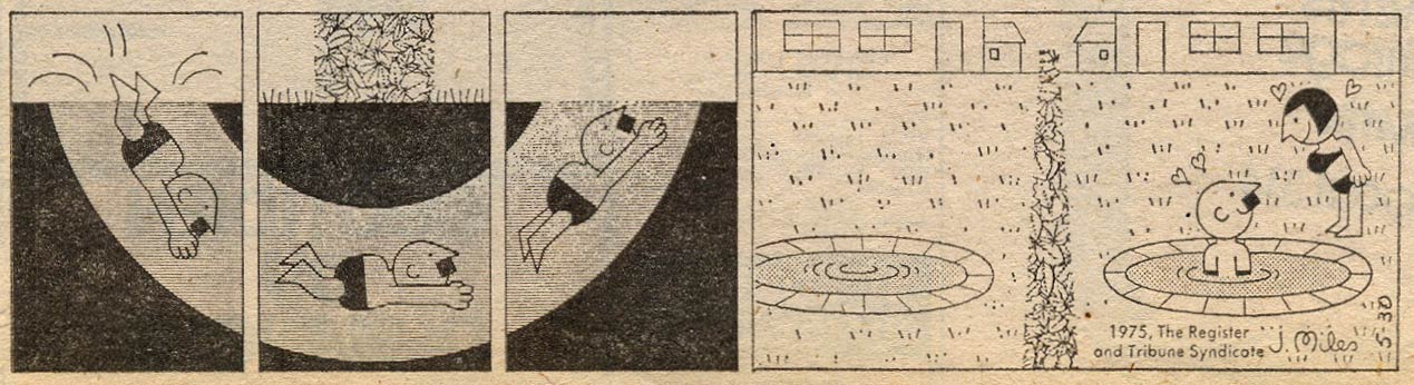 Other syndicated features by Miles were 'MicroMouse', 'Rumpuss', 'Depussy' and 'Figures of Speech' (1980-1992), while the artist additionally worked as a cartoonist for papers and magazines like She Magazine, the Daily Mirror, Punch, Dandy, Woman's Realm, Radio Times, Sunday Times and the Daily Express.