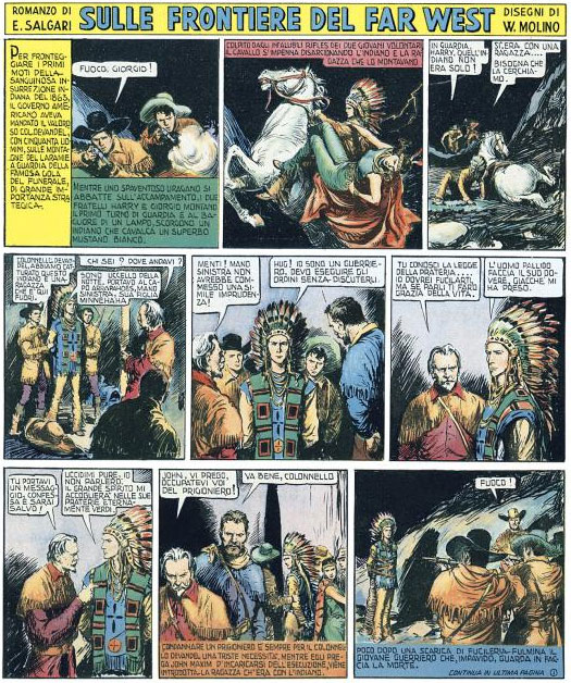 While his fame as an illustrator grew, Walter Molino continued to work on comic strips. After World War II, he made new adventure serials, for instance the title feature of the short-lived magazine Dinamite (1945), published by Casa Editrice Primula. The stories were written by Luciano Pedrocchi (not to be confused with Federico Pedrocchi), and later published in French small-format comic books like Super Dynamite and Plutos. For Dinamite, Molino also made a comic adaptation of the Emilio Salgari novel 'Tom il Vendicatore' (1945) with scriptwriter M. Caroli. Between 1946 and 1949, Molino adapted more Salgari stories to the comic format for the weekly Salgari. Molino's Salgari adaptations found their way to a French audience through translations in Hardi les Gars (1945), Les Contes du Far-West (1946-1947), Gong (1950) and Targa (1951). Starting in 1945, new satirical cartoons by Walter Molino appeared in Rizzoli's Candido magazine.