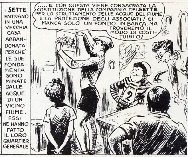 In 1937, Walter Molino began his collaboration with the publisher Arnoldo Mondadori, who was then still operating under the banner Anonima Periodici Italiana (API). Molino's first serial was 'Zorro della Metropoli' ("Metropolis Zorro", 1937), about a masked vigilante leading a revolt against a vicious landowner in a small western village. Although serialized in Paperino, Mondadori's new magazine named after Walt Disney's Donald Duck, Molino's feature predated Disney's Zorro and was not related to this American pulp hero. The scriptwriter was Cesare Zavattini, with whom Molino also made 'La Compagnia dei Sette' ("The Company of the Seven"), published in the 1938 and 1939 volumes of the Almanaccco Topolino. Years later, in 1948, this feature about an adventurous gang of kids was concluded in a third episode, written by Federico Pedrocchi and drawn by Raffaele Paparella for Topolino magazine. In 1945, a novel series with the same characters by Pedrocchi and illustrated by Carlo Cossio was published by Carroccio.
