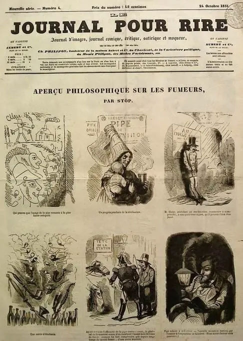 In an issue of Le Journal Pour Rire (21 October 1851), Morel-Retz drew some thematically connected cartoons ridiculing smokers. Some of these juxtaposed one-panel cartoons make use of narrative sequences. Around 1870 Morel-Retz made four thematically connected cartoons about the budget problem of the government, which appeared in Le Charivari. All four feature gags about a huge bag of money, depicted as some kind of monster. In a sense these could be interpreted as a prototypical text comic. During his lifetime Morel-Retz published cartoon books like 'Musée de Famille' (August 1858), 'Bêtes et Gens' (1877) and 'Salon Humoristique Illustré' (1888). He wrote two volumes of fables, which he illustrated personally, such as 'Bêtes et Gens' (1877), and literary works/plays like 'Un Soupçon' (1886) and' Sept Petites Pièces de Vers' (1895).